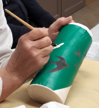 3 – dans votre atelier hebdo ou lors de la pratique partagée : pose de la réserve sur votre pièce et émaillage avec les conseils de vos animatrices en atelier hebdomadaire.
